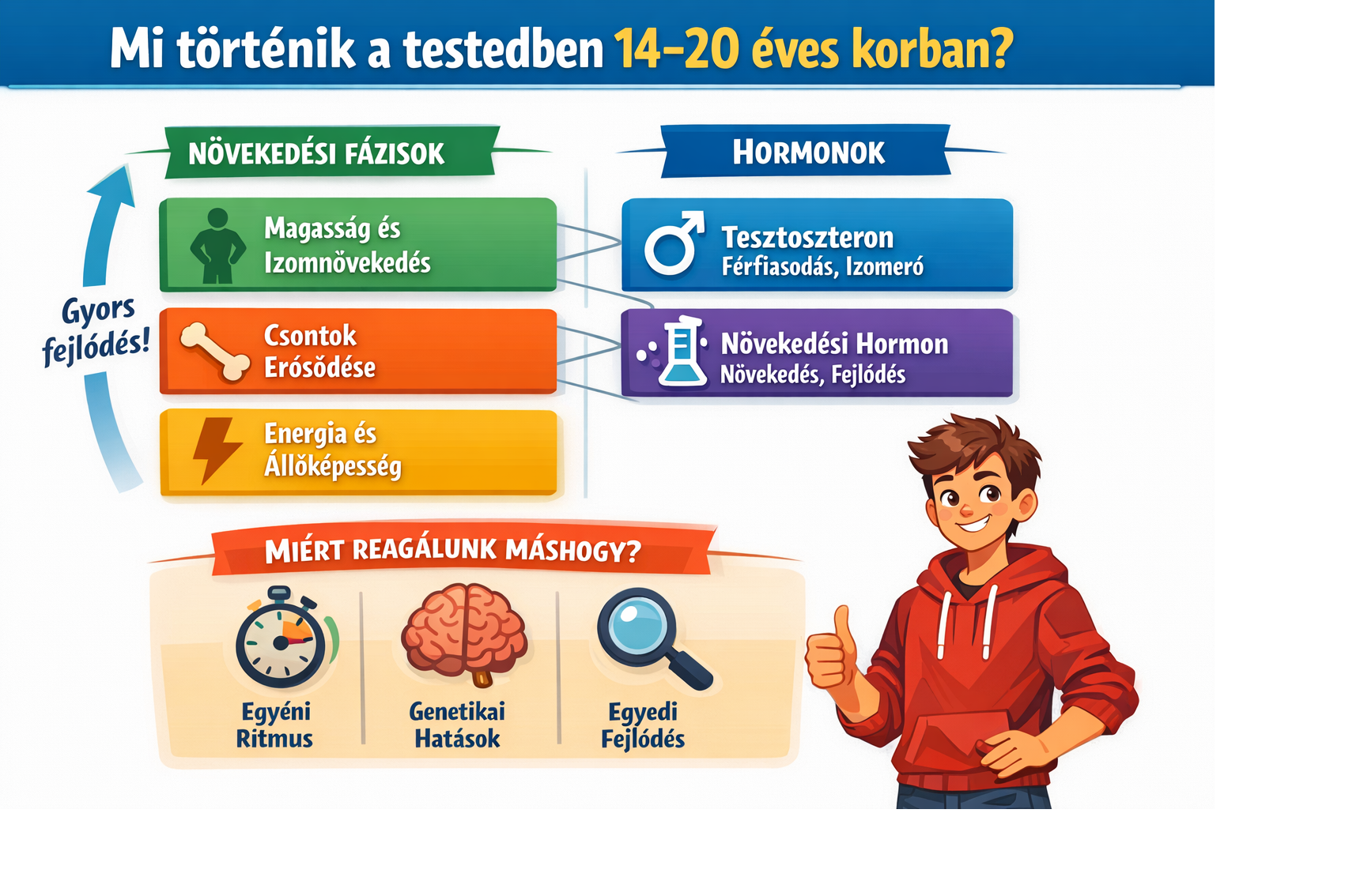 Ez a blokk arról szól, hogy megismerd a tested működését, és rájöjj, hogy minden változás teljesen normális – sőt, izgalmas! A 14–20 éves kor egy olyan időszak, amikor a tested szó szerint "növekedési rakétára" kapcsol: izmaid, csontjaid, hormonjaid mind dolgoznak, hogy egy erősebb, gyorsabb, energikusabb verzióddá válj.